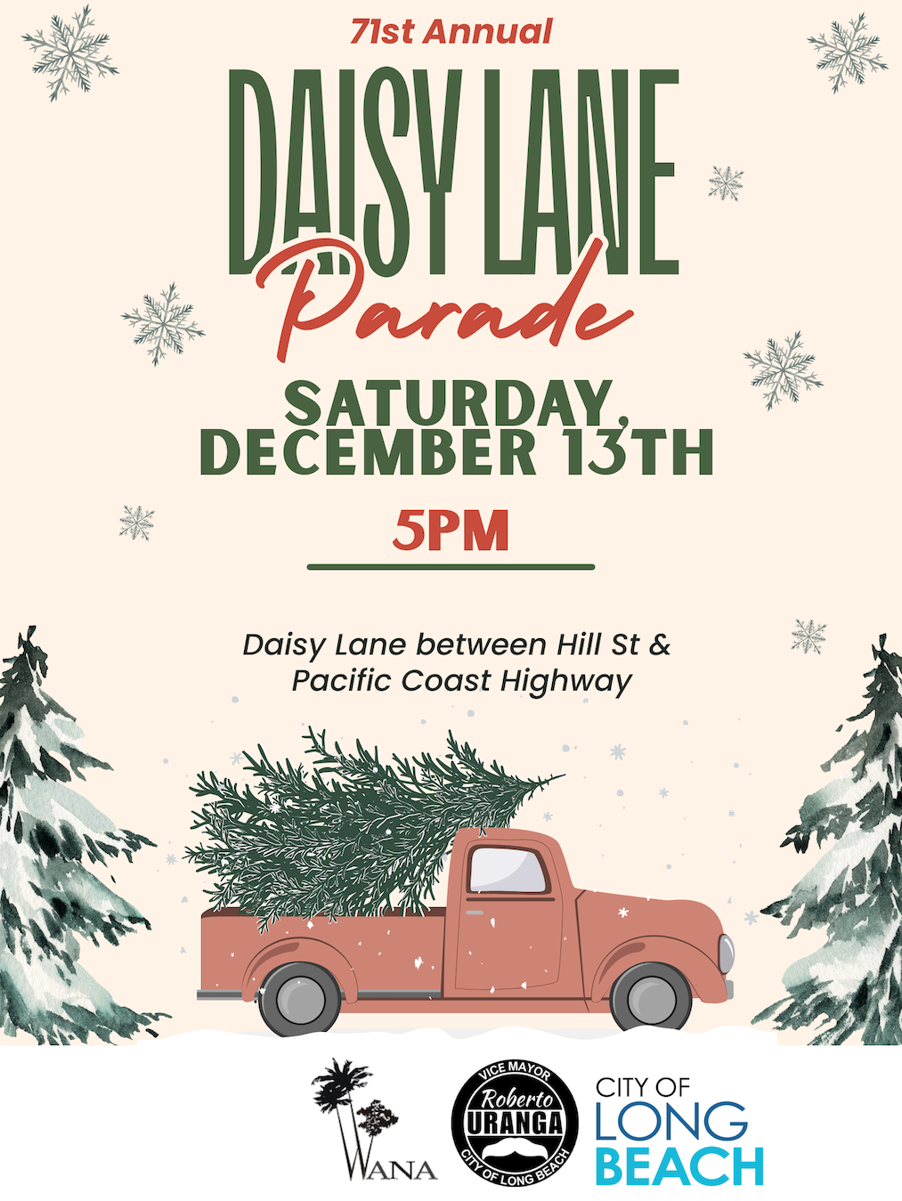 The annual Daisy Parade presented by the City of Long Beach and Councilmember Roberto Uranga is Saturday, December 13, 2025, at 5pm. on Daisy Avenue.